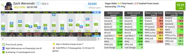 Zach Werenski - CLS (DK: $5400, FD: $6600)