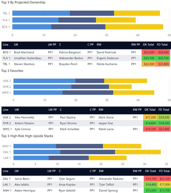 Line stacking is a common strategy in GPP. You’ll see a lot of winning lineups where players are stacked from the same forward lines or power play lines. DraftKings allows a maximum of 6 skaters from the same team (with skaters from at least 3 teams) and FanDuel allows a maximum of 4 skaters from one team. In tournaments, you'll often see 3-3 stacks (meaning 3 players from one team and 3 from another team), 4-3, and 3-3-2 stacks.