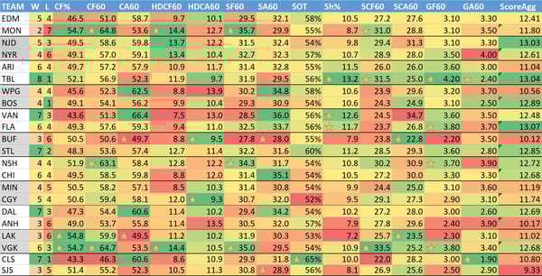 ScoreAgg: Summed numbers of a teams GF60, xGF60 and the opponent's GA60 and xGA60.