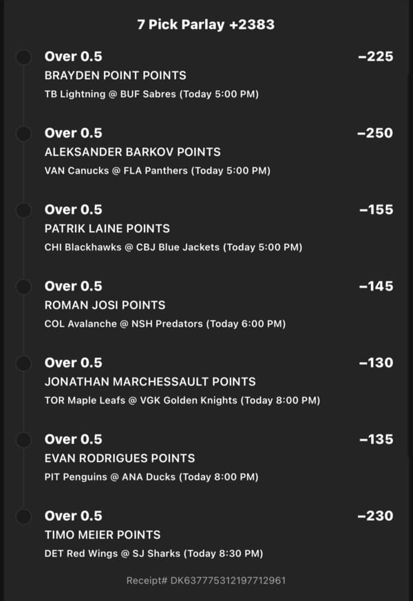 I've got an EZZZZZ 7-leg parlay for tonight. Feel free to play singles or take a few and make your own parlay.