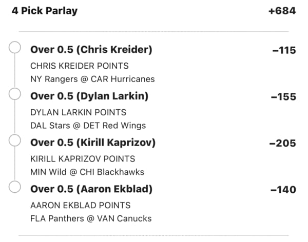 I've got an EZZZZZ 4-leg parlay for tonight. Feel free to play singles or take a few and make your own parlay.