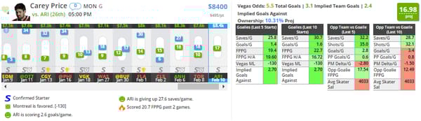 Normally, I'd be all over Merzlikins, but Columbus will be without Seth Jones, Cam Atkinson, Josh Anderson, Dean Kukan, Ryan Murray, Alexandre Texier, Alexander Wennberg and Jooonas Korpisalo tonight. Oh yeah, and they're facing Tampa. No thanks. Instead, I'll take a flyer on an overpriced Carey Price tonight. He should see a good number of shots with Arizona averaging 32 SOG a game in their past 10 games.