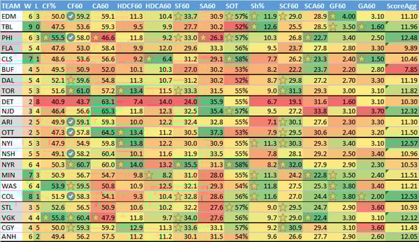 ScoreAgg: Summed numbers of a teams GF60, xGF60 and the opponent's GA60 and xGA60.