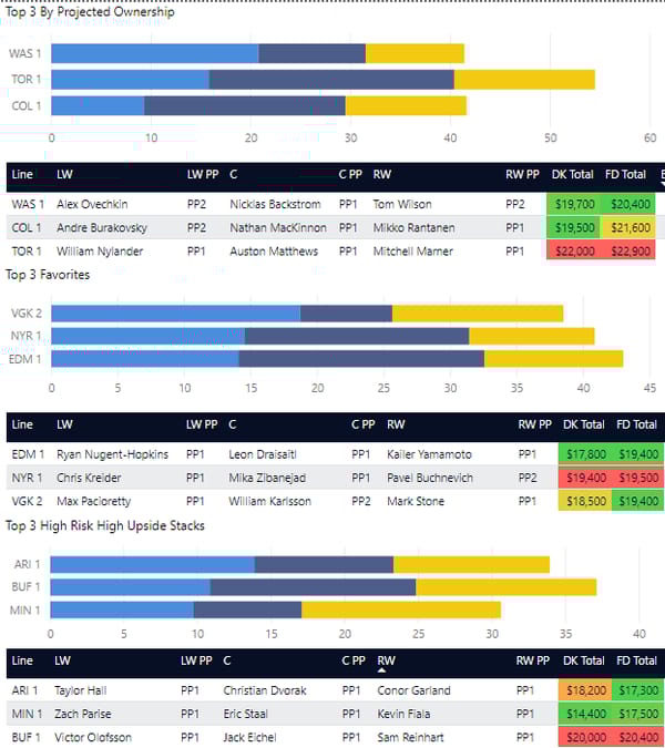 Tournament/High Ceiling: Less focused on stacking, but trying to get players that can score high. You have to be careful, as hockey is a high variance sport, which means that you can absolutely have some dud lineups.