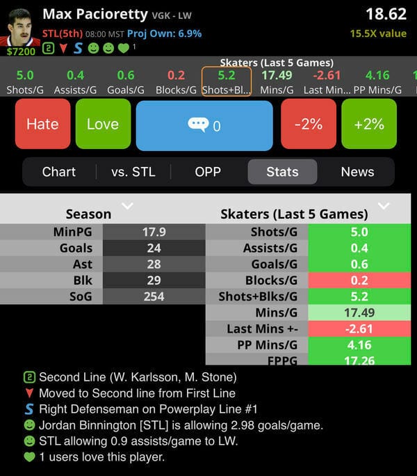 Max Pacioretty -VGK (DK: $7200, FD: $7200)