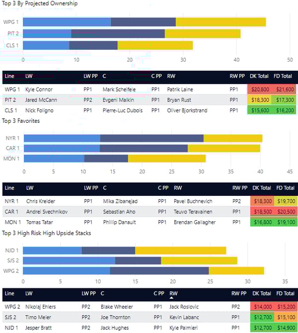 Line stacking is a common strategy in GPP. You’ll see a lot of winning lineups where players are stacked from the same forward lines or power play lines. DraftKings allows a maximum of 6 skaters from the same team (with skaters from at least 3 teams) and FanDuel allows a maximum of 4 skaters from one team. In tournaments, you'll often see 3-3 stacks (meaning 3 players from one team and 3 from another team), 4-3, and 3-3-2 stacks.