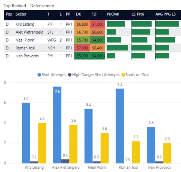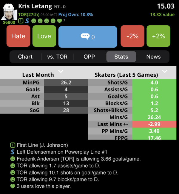 I can't ever pick the right PIT line to stack to save myself. So instead, I'm going to go with Letang and hope I can luckbox my way to a few assists.