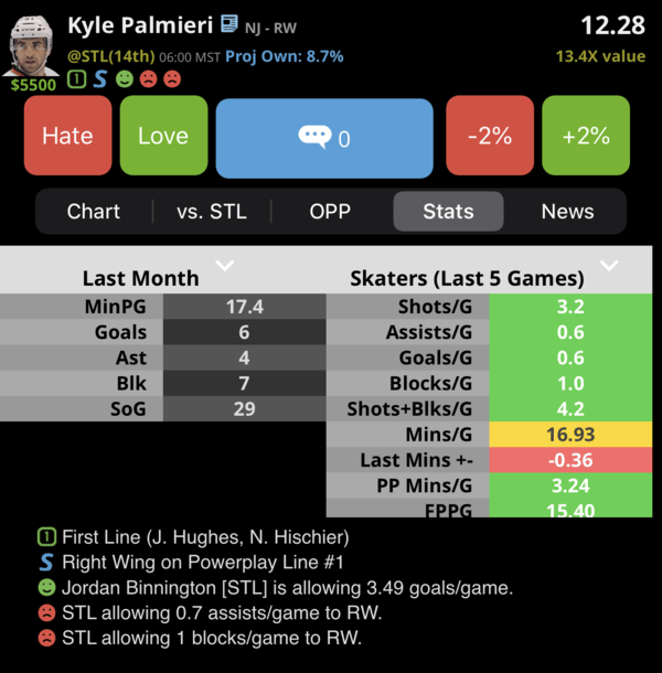 Connor and Laine should be high owned and I wouldn't fault you for having either in your lineup, but if you're looking for that late night hammer, I think Palmieri is a good option tonight.