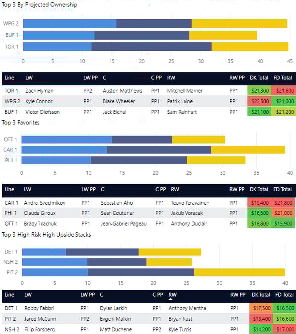 Does that mean you should slam WPG3 into your lineups? Probably not. They don't have a very high ceiling. However, if you're looking to risk it for the biscuit tonight and want a top line stack like BUF1, but want to pair it with a cheaper line stack, WPG3 might make a good pair.