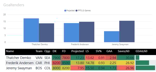 My preference is to correlate goalie with one of my stacks, but my favorite tonight is: