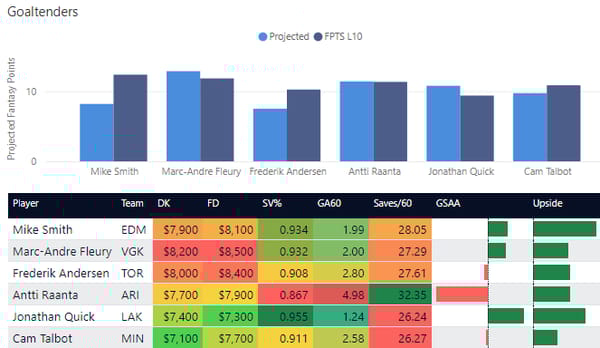 How to Interpret This: I've added LineStar Projected Ownership, LineStar Projected Fantasy Points, and Goalie GAA (Goals Saved Above Average), and Saves/60, along with my projected upside for each goalie. Generally, I'm looking for goalies that I think will get a win with a positive (green) GSAA and a high saves number.