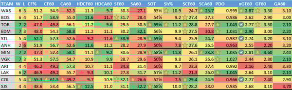 Here's numbers on the teams from their past 10 games. Generally, I start my research by looking for teams in good spots. For example, teams that score goals (GF60) that are facing teams that give up goals (GA60). I also look at teams that shoot a lot (CF60) that are facing teams that give up a lot of shots (CA60).