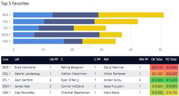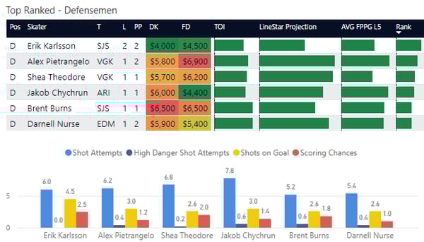 How to Interpret C/D/W charts: In NHL DFS, I think it's most important to look at peripheral stats instead of goals which is why I put so much emphasis on shots. This includes shot attempts, high danger shot attempts (those shot attempts closest to the net with the highest probability of going into the net), and shots on goal. I've included projections and average fantasy points to see how each compares so you can more easily find value.
