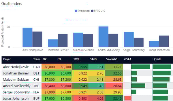 I'm giving you a comparison of LineStar projections vs the average fantasy points scored over their last 10 games. I've also given you their save percentage (over 0.910 is ideal), goals allowed (lower is better), saves per game (more is better), GAA (Goals Saved Above Average), and my projected upside for each goalie.