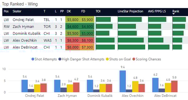How to Interpret C/D/W charts: In NHL DFS, I think it's most important to look at peripheral stats instead of goals which is why I put so much emphasis on shots. This includes shot attempts, high danger shot attempts (those shot attempts closest to the net with the highest probability of going into the net), shots on goal, and scoring chances. I've included projections and average fantasy points to see how each compares so you can more easily find value.