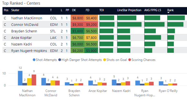 How to Interpret C/D/W charts: In NHL DFS, I think it's most important to look at peripheral stats instead of goals which is why I put so much emphasis on shots. This includes shot attempts, high danger shot attempts (those shot attempts closest to the net with the highest probability of going into the net), shots on goal, and scoring chances. I've included projections and average fantasy points to see how each compares so you can more easily find value.
