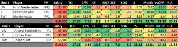 I like the top two lines for Carolina tonight. I don't have a lot of interest in the third line for Carolina as none of the forwards are on either of the power play lines. CAR2 is my favorite of the two lines, and I think