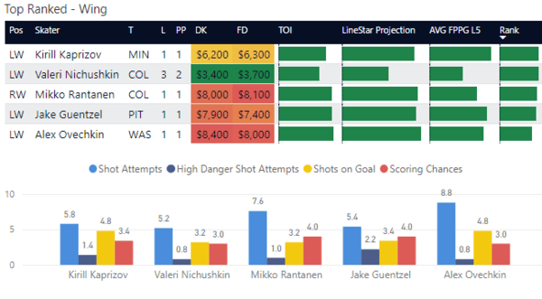 How to Interpret C/D/W charts: In NHL DFS, I think it's most important to look at peripheral stats instead of goals which is why I put so much emphasis on shots. This includes shot attempts, high danger shot attempts (those shot attempts closest to the net with the highest probability of going into the net), shots on goal, and scoring chances. I've included projections and average fantasy points to see how each compares so you can more easily find value.