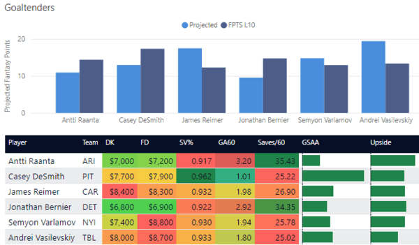 I'm giving you a comparison of LineStar projections vs the average fantasy points scored over their last 10 games. I've also given you their save percentage (over 0.910 is ideal), goals allowed (lower is better), saves per game (more is better), GAA (Goals Saved Above Average), and my projected upside for each goalie.