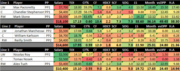 Vegas lines got shuffled a little this morning. I'll have shares of the top two lines, but I prefer the Marchessault-Karlsson-Smith line tonight.