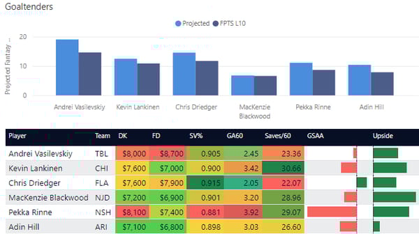 I'm giving you a comparison of LineStar projections vs the average fantasy points scored over their last 10 games. I've also given you their save percentage (over 0.910 is ideal), goals allowed (lower is better), saves per game (more is better), GAA (Goals Saved Above Average), and my projected upside for each goalie.