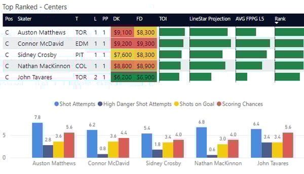 How to Interpret C/D/W charts: In NHL DFS, I think it's most important to look at peripheral stats instead of goals which is why I put so much emphasis on shots. This includes shot attempts, high danger shot attempts (those shot attempts closest to the net with the highest probability of going into the net), shots on goal, and scoring chances. I've included projections and average fantasy points to see how each compares so you can more easily find value.
