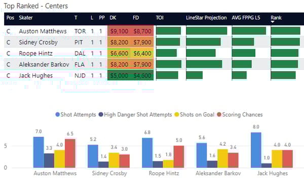 How to Interpret C/D/W charts: In NHL DFS, I think it's most important to look at peripheral stats instead of goals which is why I put so much emphasis on shots. This includes shot attempts, high danger shot attempts (those shot attempts closest to the net with the highest probability of going into the net), shots on goal, and scoring chances. I've included projections and average fantasy points to see how each compares so you can more easily find value.