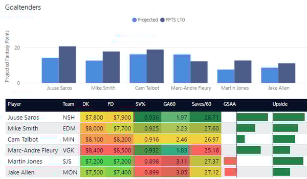 I'm giving you a comparison of LineStar projections vs the average fantasy points scored over their last 10 games. I've also given you their save percentage (over 0.910 is ideal), goals allowed (lower is better), saves per game (more is better), GAA (Goals Saved Above Average), and my projected upside for each goalie.