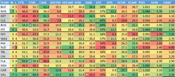 Here's numbers on the teams from their past 10 games. Generally, I start my research by looking for teams in good spots. For example, teams that score goals (GF60) that are facing teams that give up goals (GA60). I also look at teams that shoot a lot (CF60) that are facing teams that give up a lot of shots (CA60).