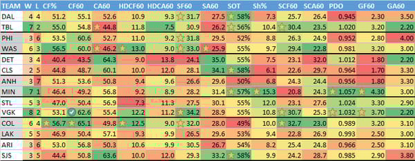 Here's numbers on the teams from their past 10 games. Generally, I start my research by looking for teams in good spots. For example, teams that score goals (GF60) that are facing teams that give up goals (GA60). I also look at teams that shoot a lot (CF60) that are facing teams that give up a lot of shots (CA60).