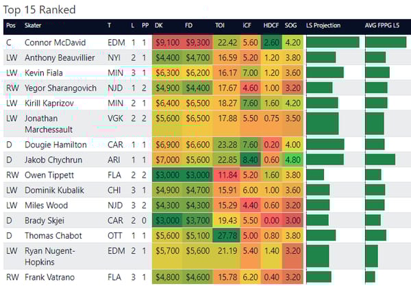 Here are my overall rankings on the top 15 skaters on the main slate. These are players that I would look to insert into my lineups as one-offs or lineup fillers if I'm stacking or double-stacking lines.