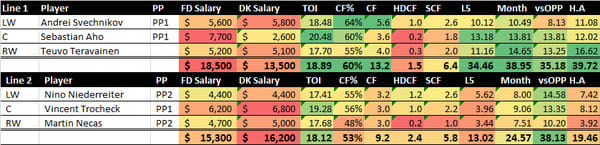 Continuing down the list, the top two lines for Carolina are next in my rankings. Carolina is one of the best teams this season and they face a Chicago team that is allowing 3.8 goals/game over their last 10.