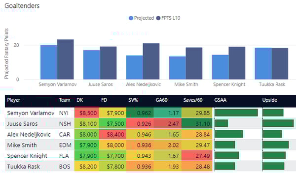 I'm giving you a comparison of LineStar projections vs the average fantasy points scored over their last 10 games. I've also given you their save percentage (over 0.910 is ideal), goals allowed (lower is better), saves per game (more is better), GAA (Goals Saved Above Average), and my projected upside for each goalie.