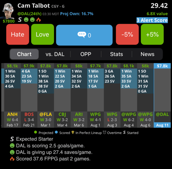 My Favorite: Cam Talbot - CGY (DK: $7600, FD: $7800)