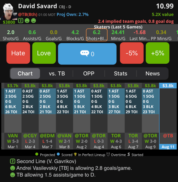 I feel like I say this in every newsletter, but I really like to fill my defensemen spots with players that take a bunch of shots, block shots, get 23+ minutes of ice time, and get time on one of the power play units. Savard checks those boxes for me. Easy.