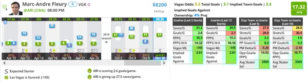 Marc-Andre Fleury - VGK (DK: $8800, FD: $8200)