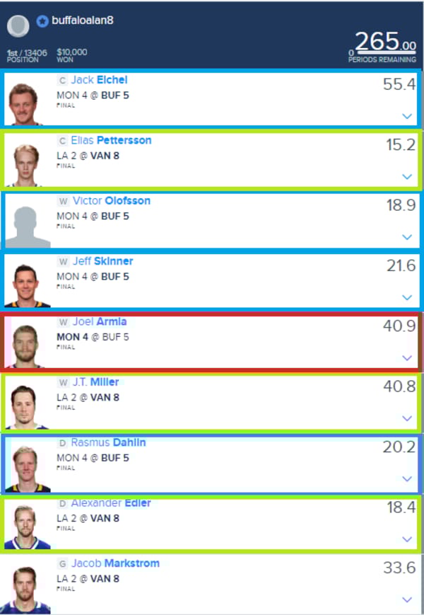 On FanDuel, buffaloalan8 won the Breakaway with a 4-3 stack of Buffalo and Vancouver with a Joel Armia one-off. He did have correlation with his goalie, as Markstrom was popular last night. Keep in mind too, he couldn't run a 5-man stack because FanDuel limits 4 skaters from the same team.
