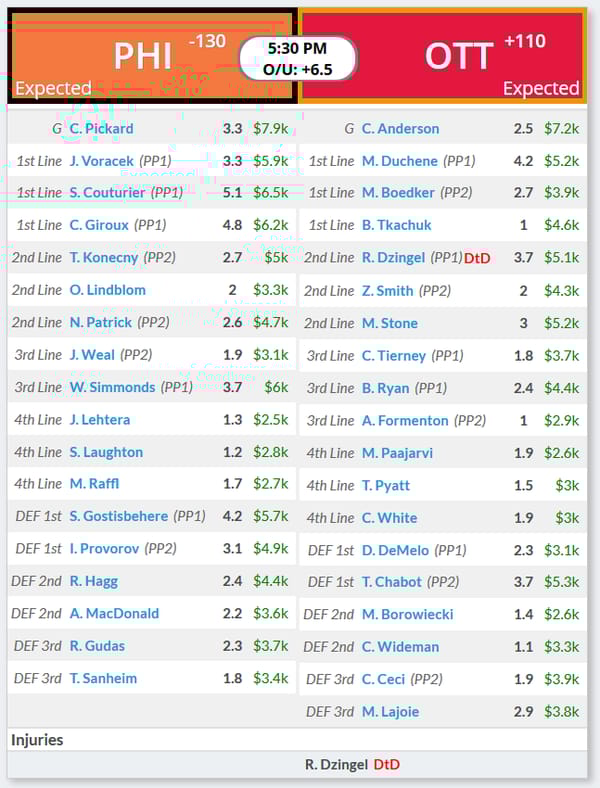 This game has the highest OU of the slate and both teams have played sloppy. Philly has a Corsi Allowed of 62.7 so far this year and Ottawa is worse at 69.8. I don't think I want any part of the goalies tonight, but if I had to pick one, it would be Anderson.