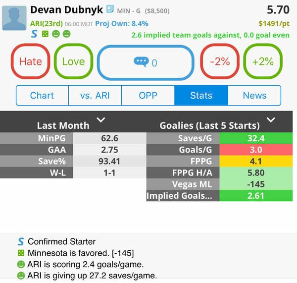 Devan Dubnyk, MIN (vs ARI) (DK: $8.5K, FD: $8.6K)