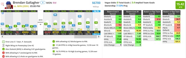Make no mistake, Pastrnak is the best play at wing tonight and should go well owned. But if you want to be a little different and save yourself some salary, I think Gallagher is the next best option.