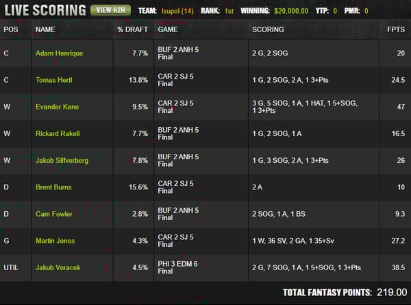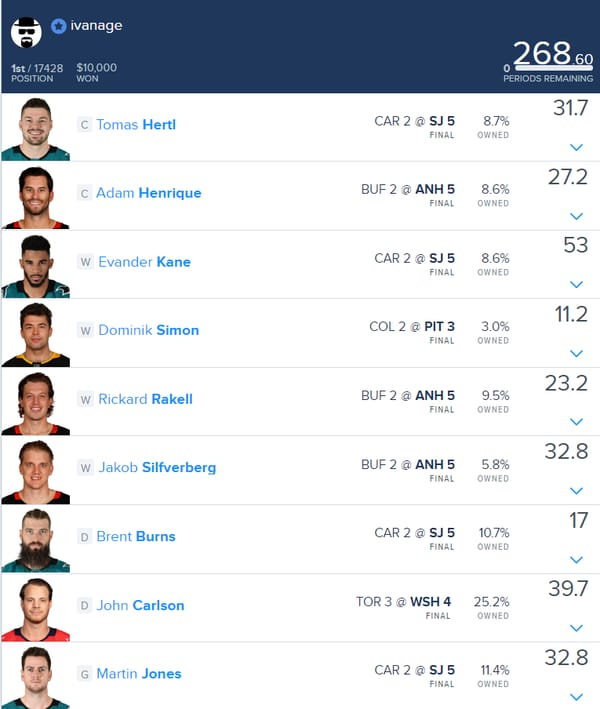 Good on you if you stacked Sharks and Anaheim - specifically if you had Kane and Hertl from San Jose and Rakell and Henrique from Anaheim. That was the nuts if you had them together. lsupol took down the Prime Time Playmaker on DraftKings with a 4-3 stack of Anaheim and San Jose with a Vocacek one-off.