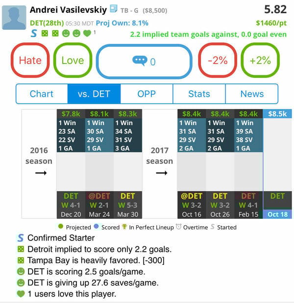 Andrei Vasilevskiy, TB (vs DET) (DK: $8.5K, FD: $9.1K)