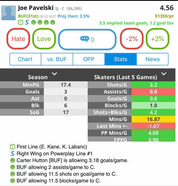 Joe Pavelski: SJ- C (DK: $6.2K, FD: $7.2K)