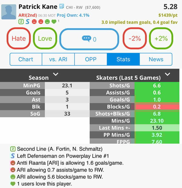 Patrick Kane: CHI - W (DK: $7.6K, FD: $8.3K)