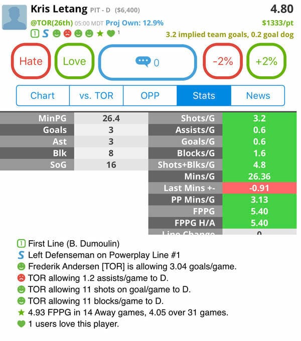 Kris Letang: PIT- D (DK: $6.4K, FD: $6.3K)
