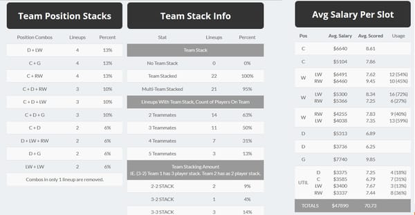 I've found this helpful in learning lineup construction (if you're new to NHL DFS or struggling to find success this season) as well as seeing average salaries by position in perfect lineups. For example, take note that on DraftKings, the average salary for goalies that end up in perfect lineups is a little over $7700. This tells me that I don't necessarily need to spend up each night, but I probably don't want to punt at goalie either.