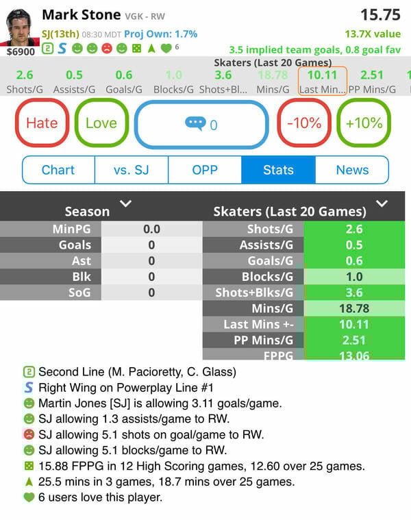 Mark Stone - VGK (DK: $6900, FD: $7400)
