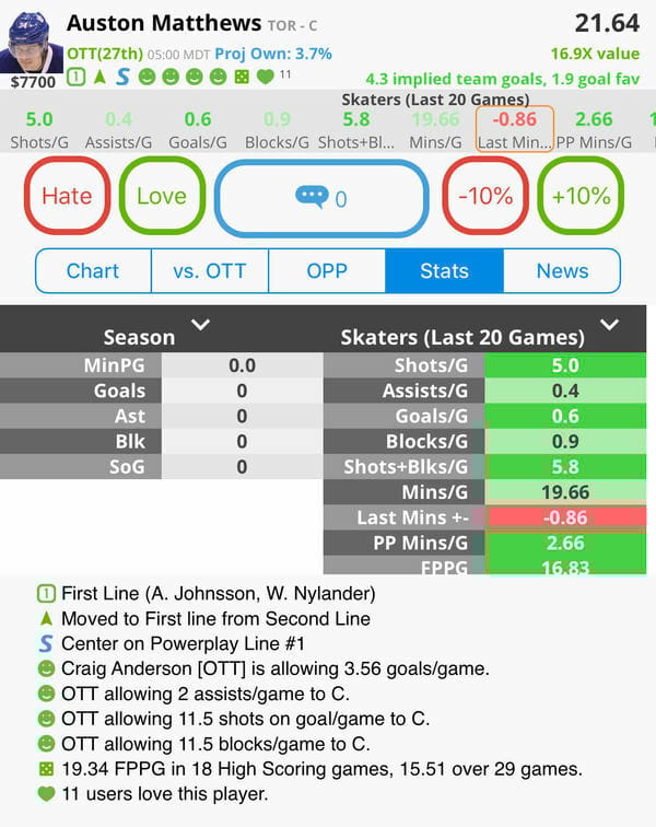 Auston Matthews - TOR (DK: $7700, FD: $8300)