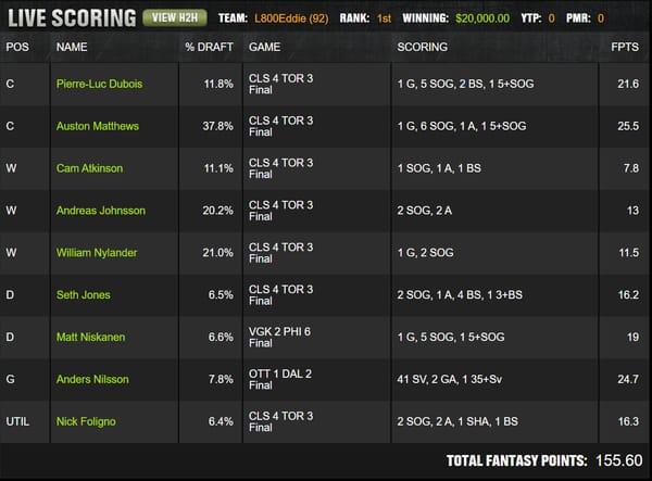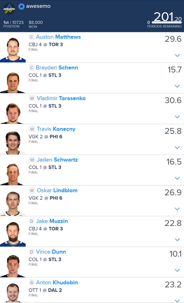 On DraftKings, 1_800Eddie won the Twine tournament with a 4-3 Columbus-Toronto stack with a Niskanen one-off.
