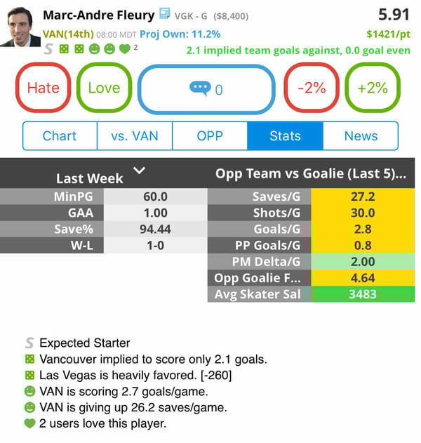 Marc-Andre Fleury, VGK (vs VAN) (DK: $8.4K, FD: $8.1K)